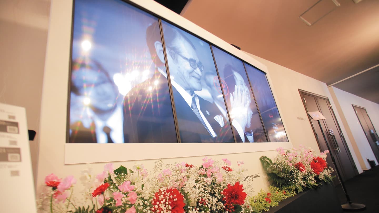 式場内モニターにて想い出の写真や大事な言葉を織り交ぜた映像を上映し、 “故人らしさ”を感じていただける空間演出です。ご遺族との打ち合わせをもとに制作された映像は、会場全体に一体感と温もりをもたらします。